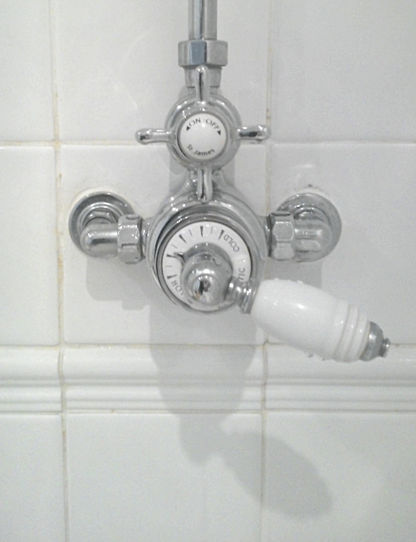 Algo que me tiene bastante contento del apartamento es la ducha. Es un sistema super inteligente, uno elige la temperatura con un comando y con el otro la intensidad: