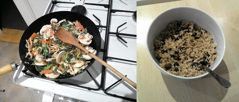 Tambien cociné de nuevo, medio que hice trampa porque compré un preparado pronto para saltar, y se lo agregué al arroz con porotos que tenía.