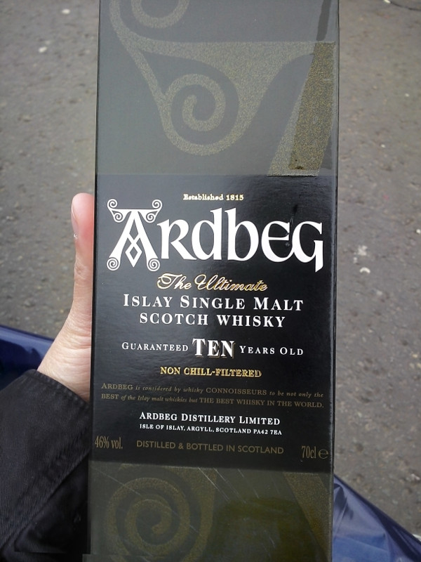 Me compré un Ardbeg 10 años, de una distilería en la costa sur de la isla Islay. El gusto ahumado viene de que usan turba (?) incendiada para secar la cebada malteada en un proceso que lleva como 30 horas. Le llaman “peatiness”, que se mide en ppm. Los whiskies normales de las Highland tienen hasta 30 ppm, los de las islas Islay hasta 50 ppm, aunque hay casos excepcionales de hasta 100 ppm. Wikipedia es mi amiga.
