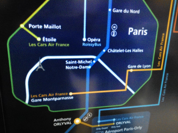 En Paris no tenía que levantar la valija, iba derecho a destino. Así que éramos la mochila y yo. Caminé un poco por el aeropuerto hasta que encontré información de transporte. El tren Paris RER hace el recorrido desde el aeropuerto hasta la ciudad y vuelta. Con una foto del recorrido y un mapa de EuroDisney de la ciudad alcanzó para moverme: